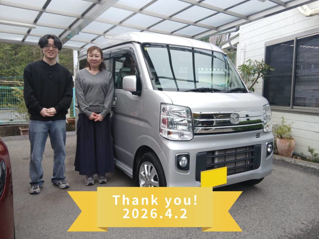 広島市のI様へ、マツダ・スクラムワゴン PZターボ 4WDを2026年4月1日にご納車いたしました。ターボと4WDの安心感に加え、12ヶ月点検と保証付きで新生活にも心強い1台です。